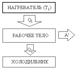 გამაცხელებელი გადასცემს სითბოს მუშა სხეულს Т1 ტემპერატურის დროს. მუსა სხეული ასრულებს სასარგებლო მექანიკურ მუშაობას A'. მაცივარი (გამაგრილებელი) იღებს ნაწილ სითბოს, ასრულებს რა ციკლურ პროცესს. A' = Q1 - Q2 სითბური ძრავის მარგი ქმედების კოეფიციენტი: |